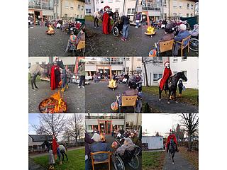 Nach Kaffee und Martinsbrezeln machten sich unsere Bewohner*innen mit ihren Laternen auf den Weg in den Garten, wo das Martinsfeuer bereits brannte. Gut eingepackt in warme Decken saßen alle beisammen und freuten sich, als Sankt Martin auf seinem Pferd über die Wiese ritt.